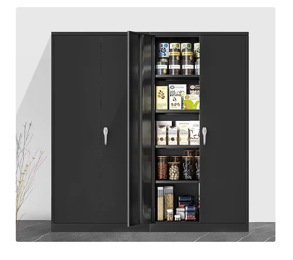 This secure metal storage cabinet is designed for office, laboratory, and institutional use, featuring adjustable shelves and a durable key lock. Made from high-quality cold-rolled carbon steel with an environmentally friendly powder coating, it offers versatile storage and a sleek black finish