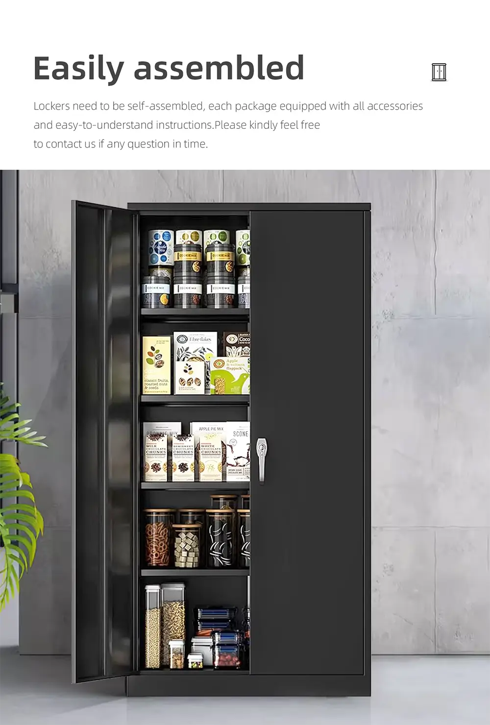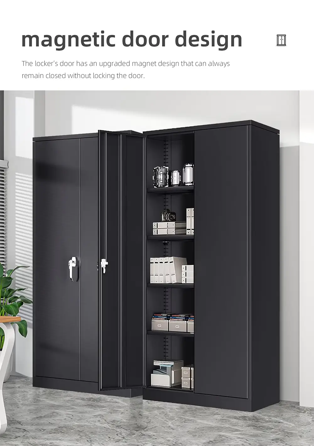 This secure metal storage cabinet is designed for office, laboratory, and institutional use, featuring adjustable shelves and a durable key lock. Made from high-quality cold-rolled carbon steel with an environmentally friendly powder coating, it offers versatile storage and a sleek black finish